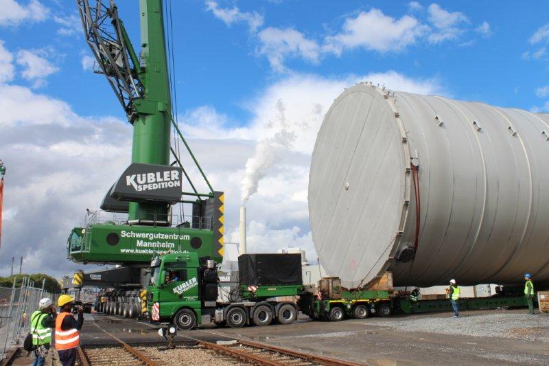 Gigantische Tanks wurden in den letzten Monaten im Mannheimer Hafen im Schwergutzentrum der Spedition Kübler in Rheinau montiert. Die Behälter waren so gigantisch groß, dass ein Transport auf der Straße undenkbar war.